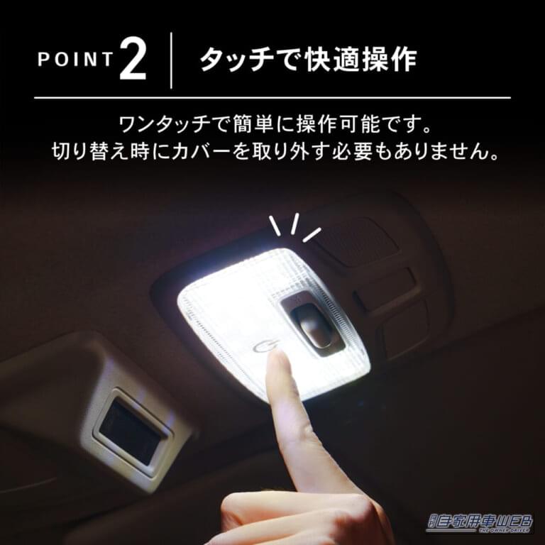 操作性は、純正スイッチのシーソー式の物理スイッチに対して、レンズのセンター付近を軽く「ポン」と触れるだけのタッチ式を採用するので快適。冬場のキャンプでグローブをしたままでも反応するので便利なのだ。さらに、一番の特徴といえるのが、調光機能だ。明るさは5段階で切り替えが可能なのだが、これに加えて色味も「ホワイト」「アンバー」「電球色」とシチュエーションに合わせて調整できるのだ。