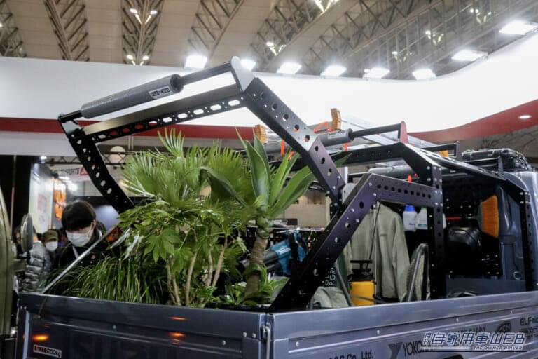 会場で大きな視線を集めていたのは、ハードカーゴといすゞA&Sが共同開発した専用キャリア。写真の植木のような大きな積み荷も楽に積載できるし、リヤの開閉式アームで積み荷の落下も防げる構造と、アレンジ性も優秀。現場で使用する工具などツール類を容易に積み下ろしできる、ユーティリティパネルや引き出しなども装備している。