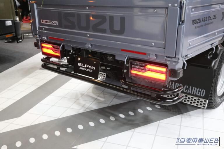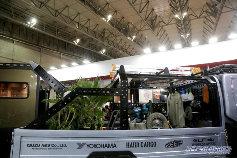 軽トラックの「アゲ系」カスタムで人気の「ハードカーゴ」といすゞA&Sが共同開発した専用キャリアを架装。ガッシリした文字どおりハードな構造のキャリアは建設や造園など「現場仕事」での使い勝手に考慮し、脚立や電動工具などの機材や資材をシステマチックに積載できるようになっている。