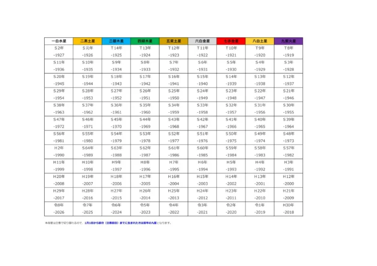 まずは自分の星を知ることから。この星が分かっていないと自分の吉方位も分からないので、まずは下記の表から自分の星を確認しておきましょう。