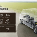 Step1:車載バッテリーにケーブルを接続 ※必要に応じて車室内の内張りのパーツの中に配線を格納