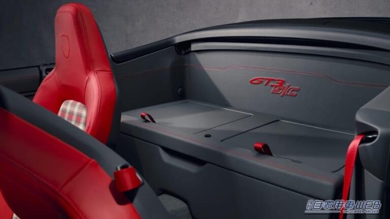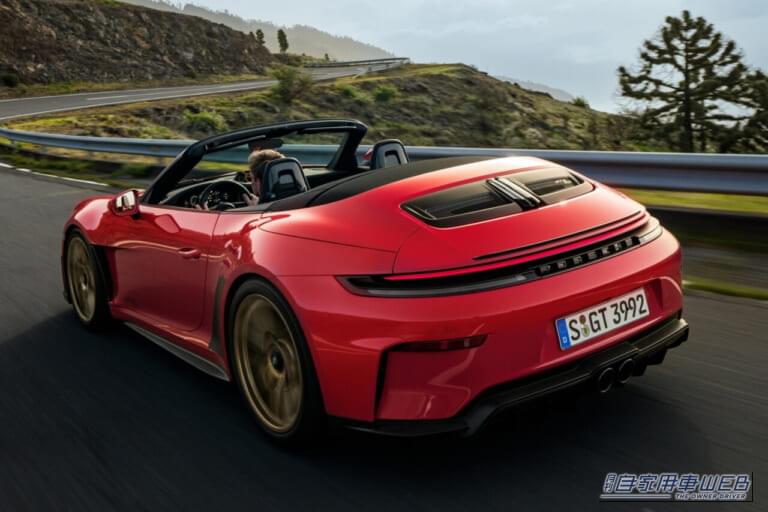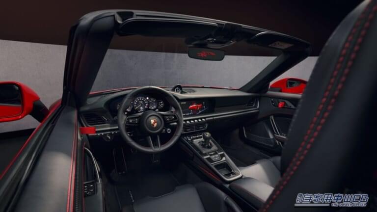 外観では、ブラックのフロントウインドウサラウンドや、911 S/T譲りのフェンダー、コンバーチブル初のガーニーフラップ付リトラクタブルリアスポイラーを採用。