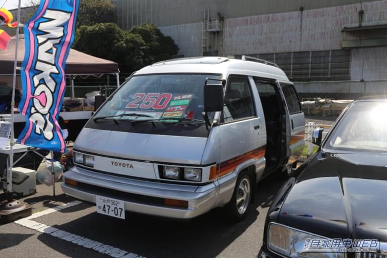 茨城県茨城町の「ふつうの車専門店 ヴィンテージカートライ」もスワップミートでブースを出展。令和のいまでは激レアなワンボックスワゴン・昭和59年式トヨタマスターエース グランドサルーンをFor Saleしていた。