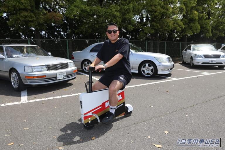 日本未発売の電動モトコンポ、ホンダモトコンパクトで会場内を回る参加者も。リアフェンダーにはドリキン土屋圭市氏のサインが。