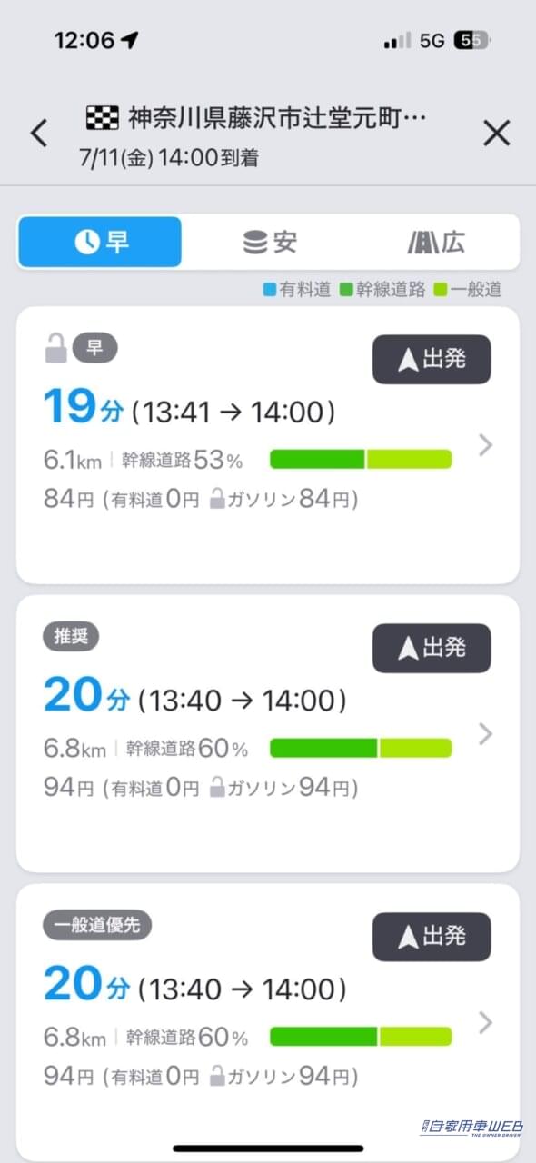 まずは神奈川県・藤沢市にある船宿『島きち丸』へ向かう。出発地点は横浜市の某コンビニからだ。コッチに船宿の情報を入力して、目的地に設定すると、目的地まで「早いルート」「安いルート」「道が広いルート」を提案してくれる。