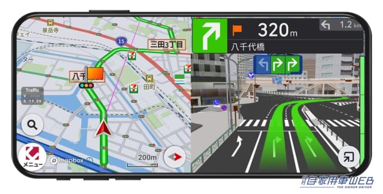 「カーナビとしても使えるよ!」といった従来のマップアプリとは違い、コッチはカーナビに特化しているだけあって、地図表示や音声案内がとても親切。例えば、複雑な交差点や高速道路の出入口などは大画面のイラストで表示してくれる。