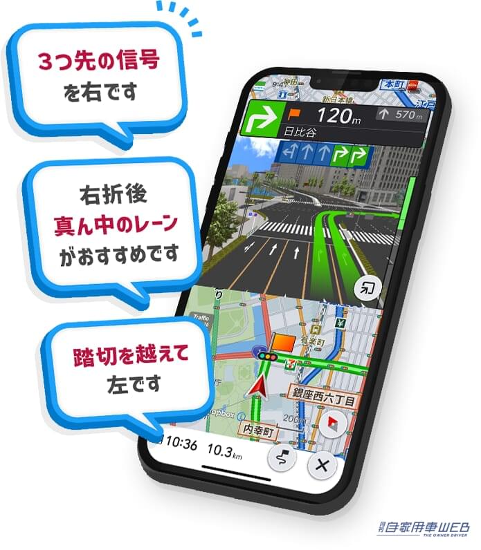 音声案内は、まるで「助手席で誰かがサポートしてくれている」のかと思うほどに丁寧。例えば、2個先の信号を左に曲がる際は、「2つ先の信号を左です」というように具体的な指示をしてくれる。さらに曲がった後の車線も「真ん中のレーンがおすすめです」といった風に教えてくれて、ドライバーは快適に運転ができる。