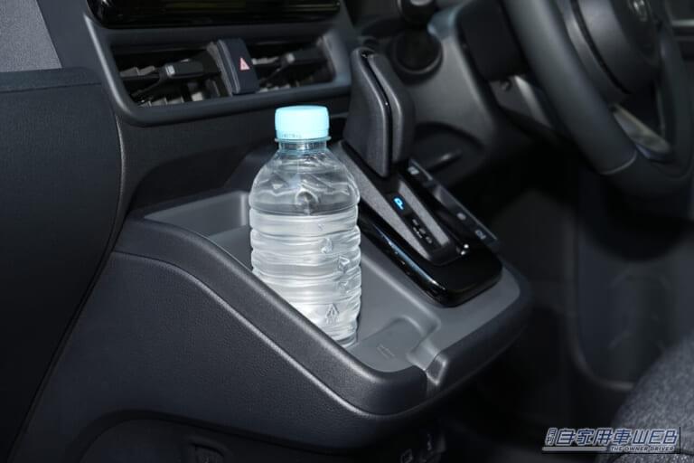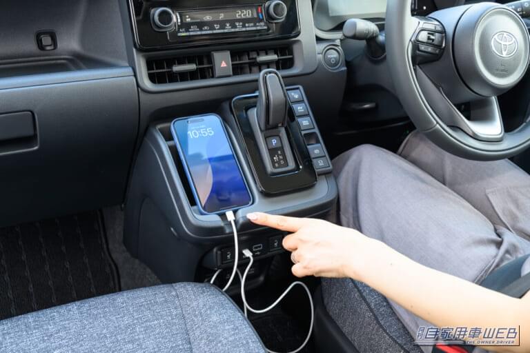 センターコンソールのシフトサイドポケットは進化し、500ミリペットボトルが収まるカップホルダーとしても、スマートフォンを充電しながら置けるラックとしても利用可能。充電中のケーブルを通すくぼみや小物置きも備わり、利便性が高まっている。