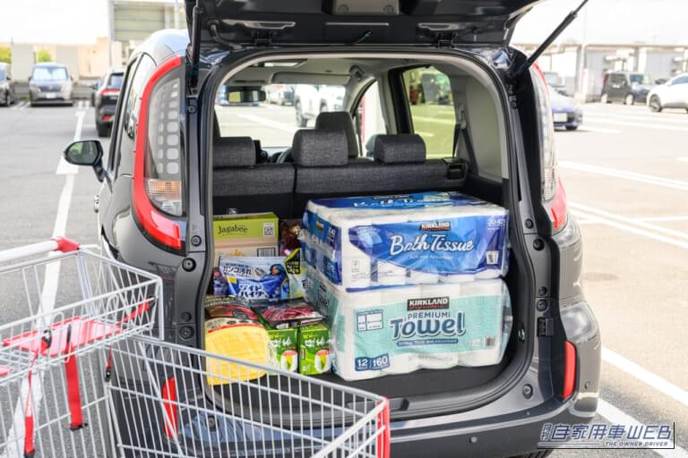 買い物後、巨大カートを満載にして戻ると、ラゲッジは横幅1265㎜、奥行き840㎜、高さ1055㎜の大容量で、すべて積み込んでもまだ余裕がある。後席を倒せば奥行きは2045㎜に拡大し、フラットで広大なスペースが広がるのも5人乗りモデルならではの特徴だ