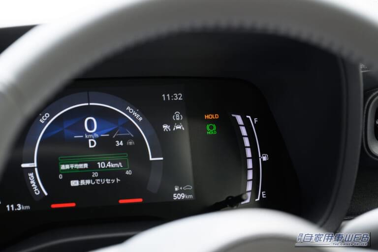 コストコの立体駐車場は長いスロープが特徴だが、1.5Lエンジン+モーターのハイブリッドは力強く走り抜けて頼もしい。坂の途中で駐車の順番待ちとなったが、今回から電動パーキングブレーキとオートブレーキホールド機能が搭載され、停止中にブレーキペダルから足を離しても保持してくれる。