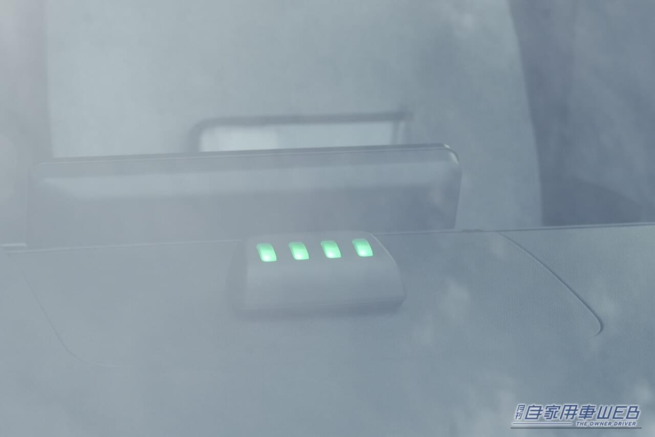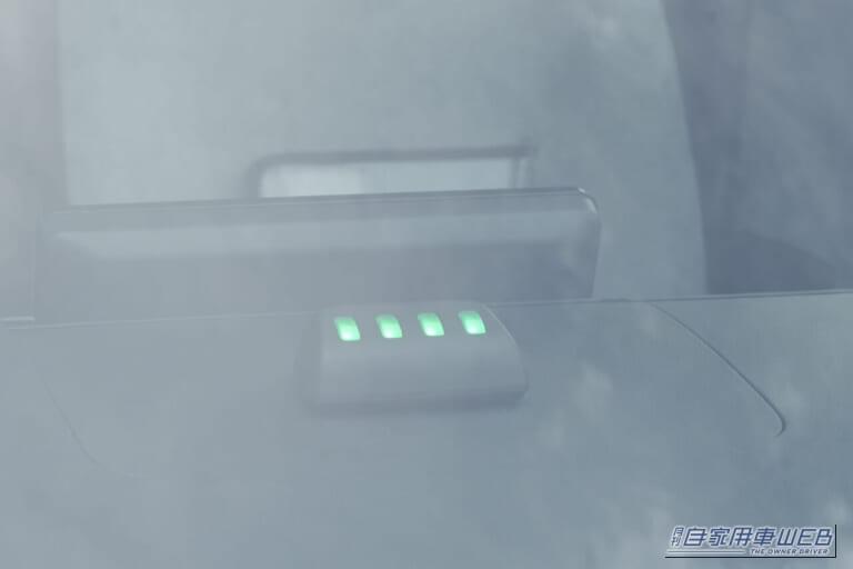 充電ケーブルを差し込んだら、ダッシュボードに設置された純正アクセサリーの「充電インジケーター」をチェック。ランプが光れば、ちゃんと接続されているサイン。車両の外からもランプを確認しやすいので、これがあれば接続ミスが防止できて安心だ。充電中以外でも、ドアロック操作時に4段階のランプ表示でバッテリー残量が確認できる便利アイテム。