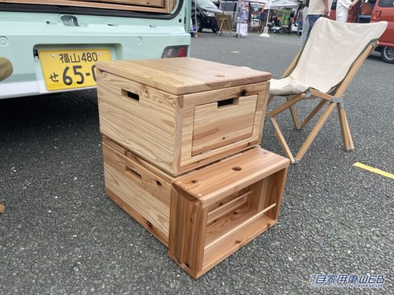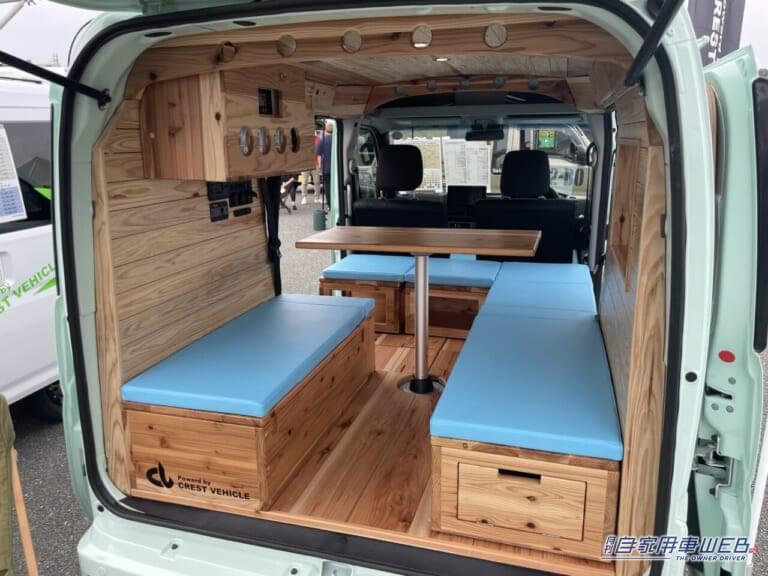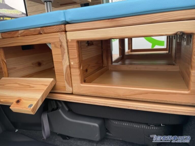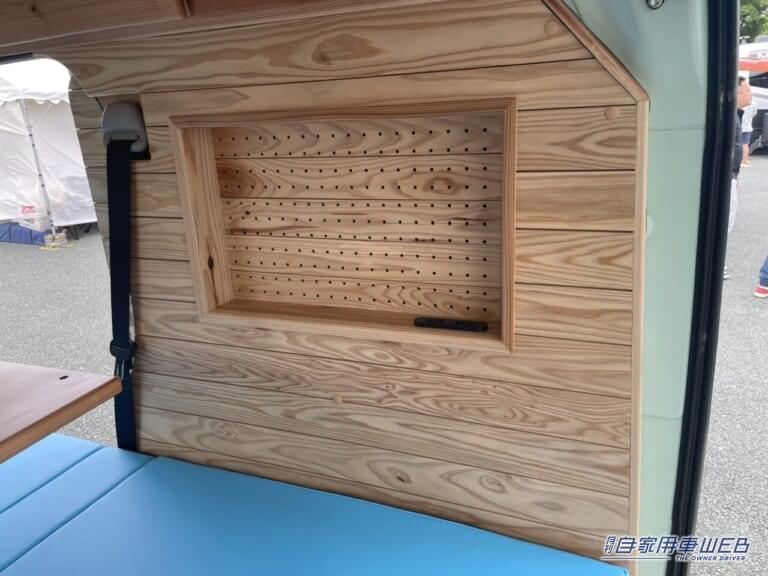 注目の荷室には大量の木材が使用されており、ログハウスのような仕上がりになっている。木箱を敷き詰めた上にフェイクレザーを置いてシートにしており、木箱を入れ替えることでレイアウトの変更ができる。もちろんフルフラットにすることも可能だ。また、木箱の側面が開いているため、レイアウト次第では長いものも積み込むことが可能。非常に工夫された作りになっている。