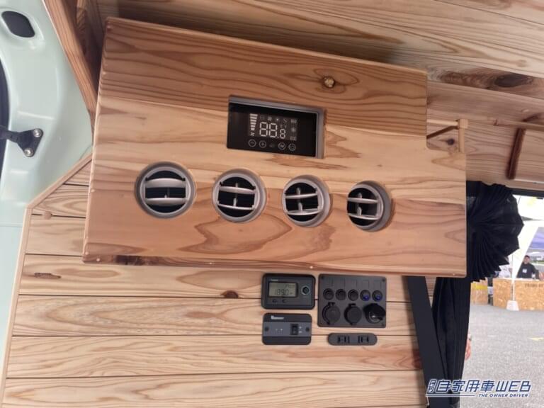 エアコンも木材で覆っておりしっかりと車内に溶け込んでいる。また、壁面には有孔ボードが設置されているので、好みに応じて様々なものを設置できる。