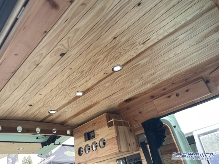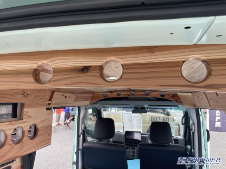 そして、車内でふと見あげると「嘘でしょ、天井まで?」と思ってしまうはず。というのも、なんと天井にまでしっかりと木材が貼られているのだ。また、丸い穴が空いた部分は、おしゃれなだけではなく実用的な側面も。ポールを通せばハンガーを掛けられるし、釣り竿を収納できるロッドホルダーとしての機能も備えている。