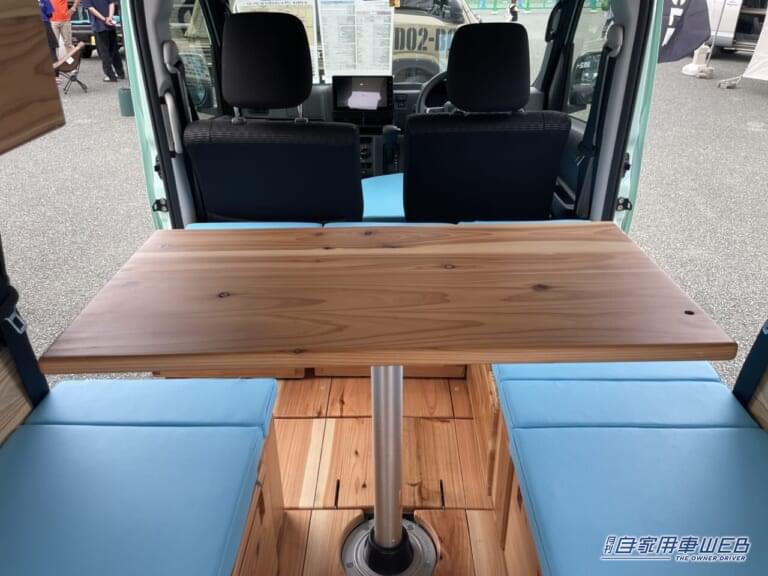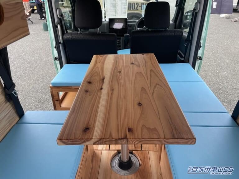 まず車内をみて思うのが「全部が木じゃん…」それもそのはず天然木を利用したボックスを自由に配置することで、無限の可能性を秘めている軽バンとは思えない自然派ラウンジ空間なのだ。