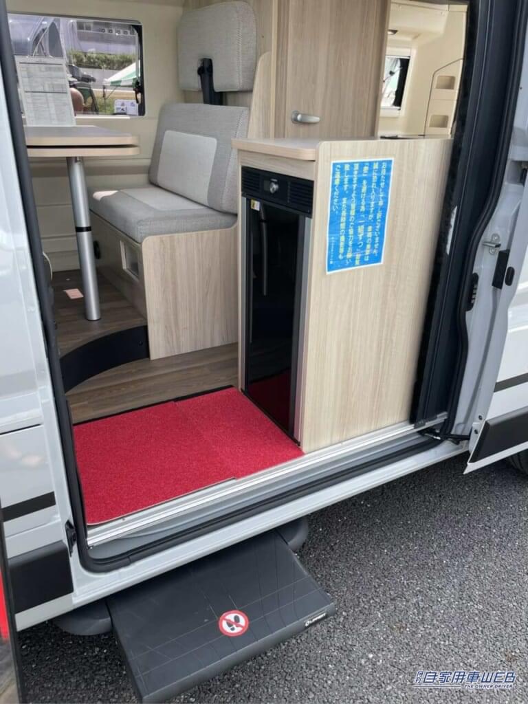 スライドドア下にはステップが設置されている。右側にあるのは冷蔵庫だ。