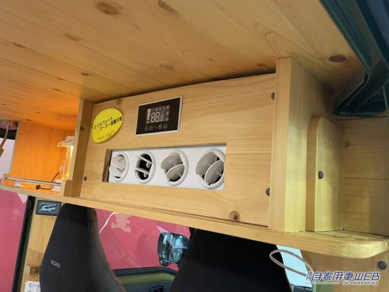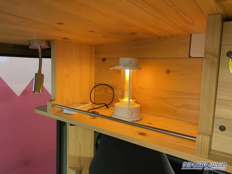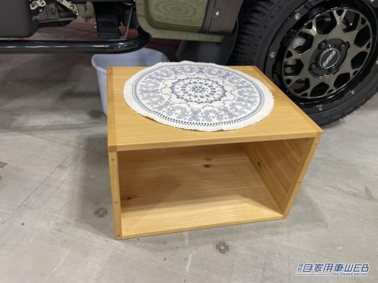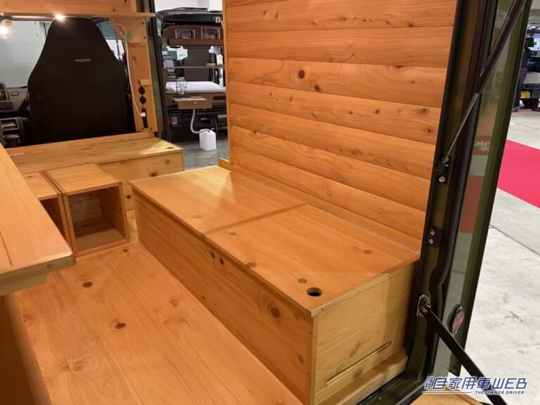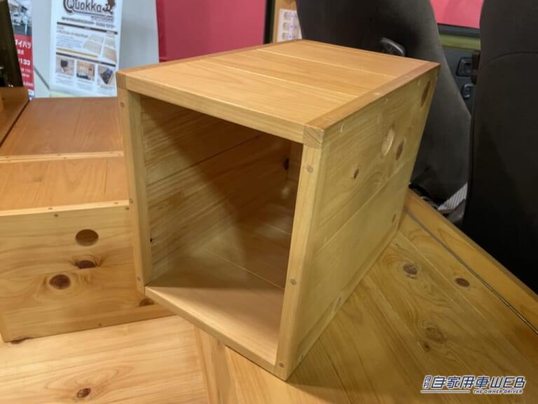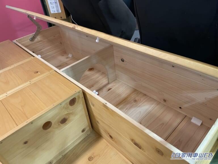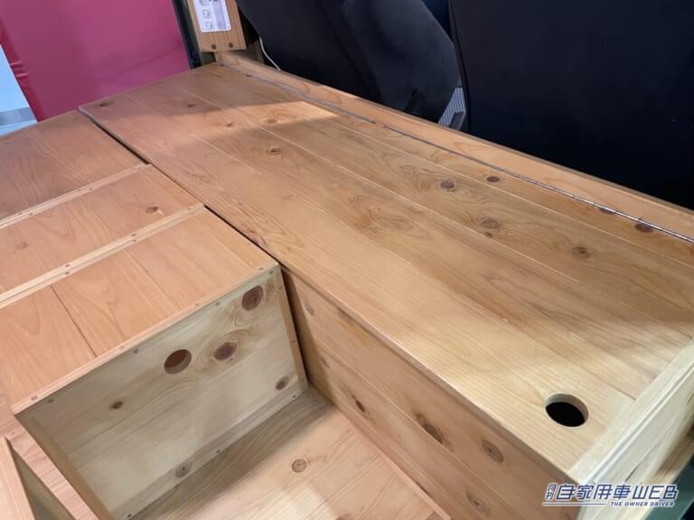 「富士ヒノキ」で作られたボックスを複数組み合わせることで、室内のレイアウトを実材に変更できる。単独でテーブルとしてむつ買うことができるので非常に便利だ。こうした機能を楽しんでいると「本当に軽トラか?」とベース車両が軽トラックであるとこを忘れさせてしまう。