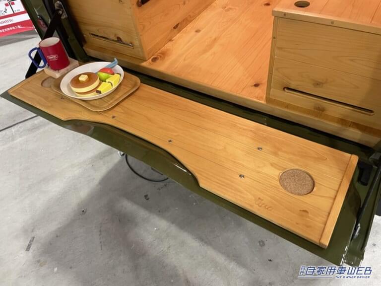 テールゲート部分は、広げるとテーブルになる仕組み。こちらにも「富士ヒノキ」が使われている。また、ルーフにはキャリアを設置しているので、車外に大型荷物を積み込むことで、室内空間を存分に活かすことができる仕組みだ。
