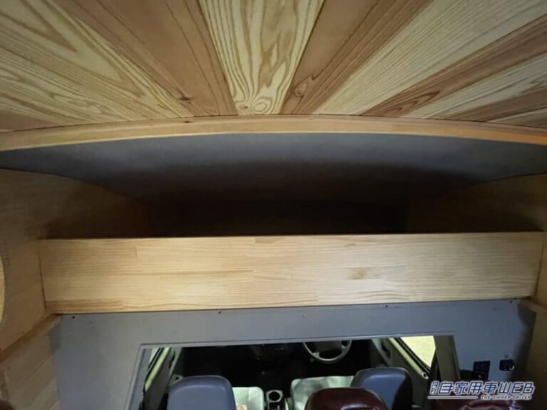 運転席側上部にも、収納スペースが。高さはないが広いので、シュラフなどを入れておくには最適。