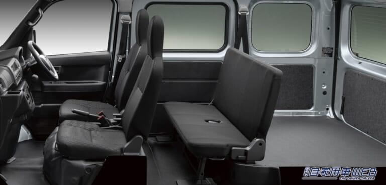 車内は2列目のシート以降のスペースがボックス席になっていて非常にシンプル。個性的なオレンジ色のシートはボディカラーとの統一感があり非常に魅力的だ。