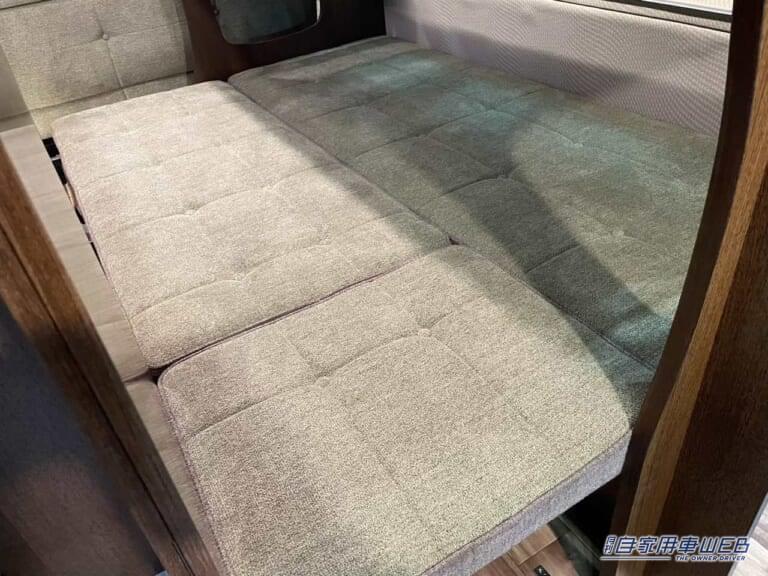 最大の魅力は、その就寝スペースだ。ベッド展開をフルに活用すれば、大人3名と子ども3名が同時に就寝できる。チャイルドベッドは120×160cm、メインベッドは180×120cm(上段60cm)と、家族全員が無理なく眠れるサイズを確保。ベッド展開の操作もシンプルで、旅先の疲れた身体をすぐに休められるのはありがたい。