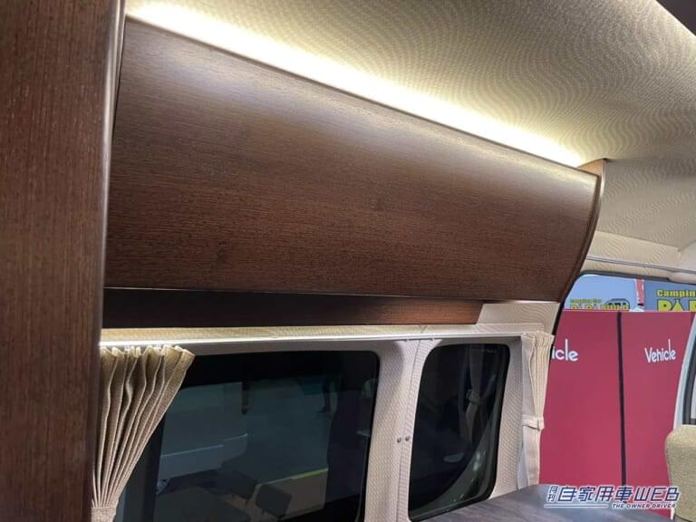 加えて、ベッドサイドにはLED間接照明を完備。横になったままの操作が可能で、夜間も安心して過ごせる。サイドオーバーヘッド収納も木目調で高級感があり、小物の整理に役立つだけでなく、走行中の荷物の飛び出しを防ぐロック機構も備える。