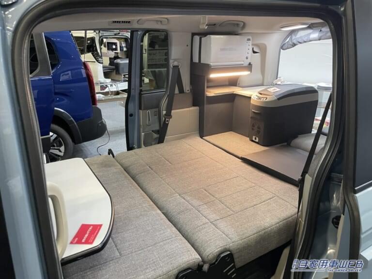 車内には、使い勝手を重視したフルフラットの快適マットが用意されており、昼間はソファとしてくつろげ、夜にはベッドとしてしっかり身体を支えてくれる設計となっている。ダイニングスペースとしても優秀で、サイドテーブルを囲んでの食事や談笑も快適そのものだ。