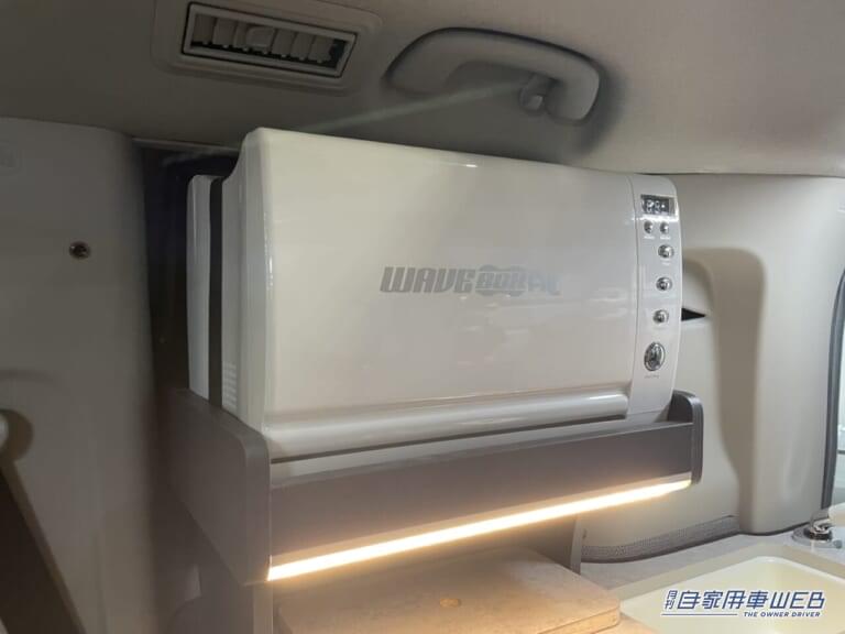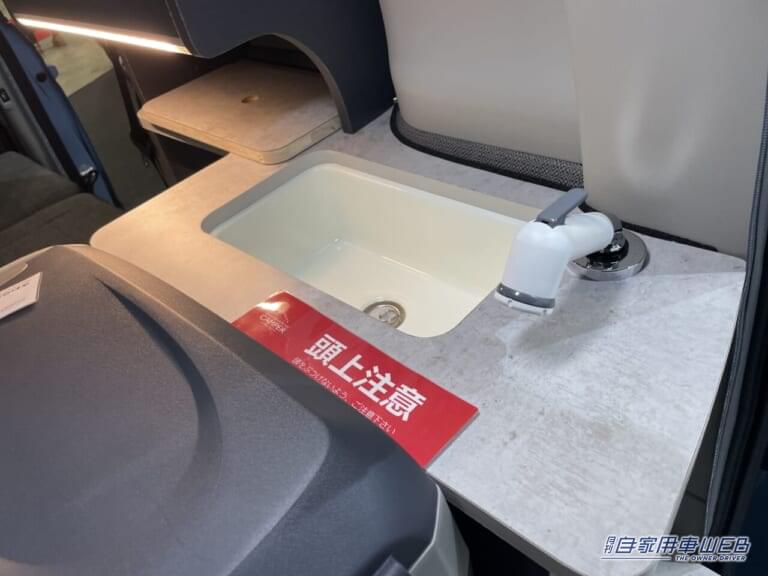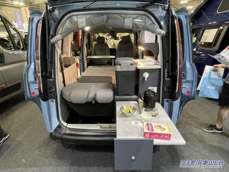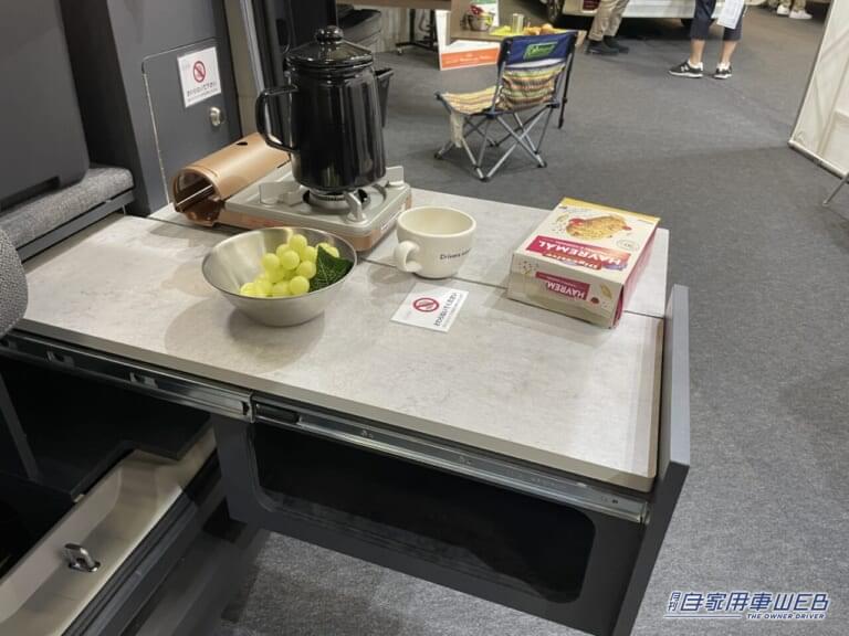 このクルマのもう一つの強みは、装備が充実した車内ギャレー(キッチン)だ。リアゲートを開ければ、すぐに屋外でも使えるキッチンスペースが出現。給排水タンクはもちろん、電子レンジや18リットルの冷蔵庫といった家電類も揃っており、本格的なアウトドアクッキングが楽しめる仕様となっている。ファミリーキャンプでも手軽に調理ができるため、食の楽しみも広がるはずだ。