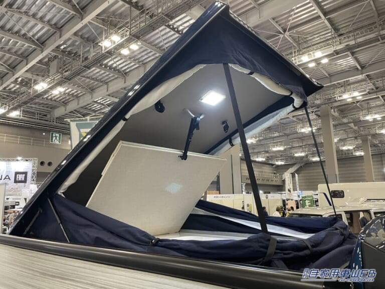 「P-SV」の最大の特徴は、ポップアップルーフによって誕生するアッパールーム。このルーフテント部分は、季節を問わず快適な空間を確保。広さは大人2名がゆったりと寝られるサイズで、昼は涼しい風を感じながらくつろぎ、夜は満点の星空を眺めながら眠るという非日常体験が味わえる。