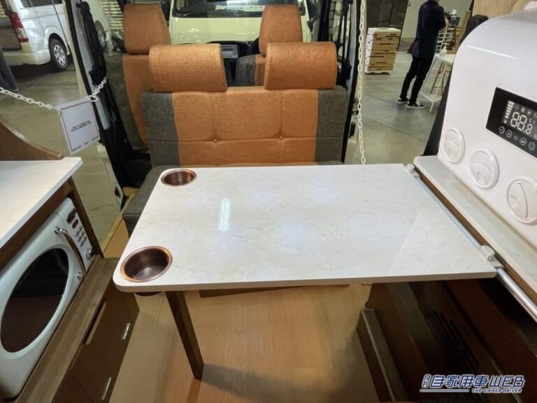 シートを倒せば、あっという間にフルフラットのベッドスペースが完成する。2人までの就寝が可能で、マットの厚みやフラット感もしっかり確保されているのが嬉しいポイントだ。さらに面白いのは、テーブルを残したままでもベッド化できる点。これにより、いわゆる“こあがり”のようなスタイルで足を伸ばして休むことができる。くつろぎ方にバリエーションがあるのは、長旅でも飽きが来ない重要な要素だ。日中はダイネットとして会話を楽しみ、夜にはそのまま寝床に早変わり。キャンピングカーならではの快適性が、コンパクトボディの中にしっかり詰まっている。