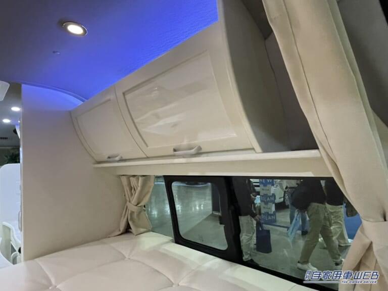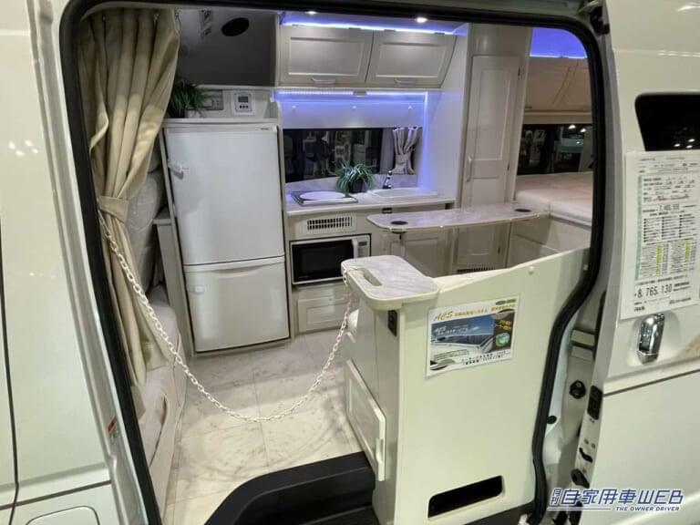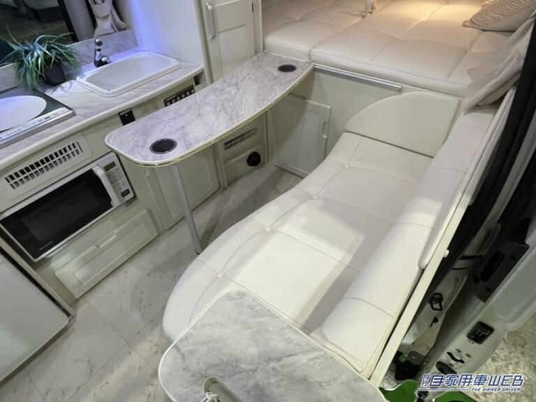 車内はオリジナルの白家具と専用白レザーで仕上げられ、明るく清潔感のある雰囲気を演出する。LED照明や間接照明を多用することで夜間の室内も快適に過ごせ、まるで移動するリビングのような感覚を味わえる。シンクやギャレーも備わっているため簡単な調理も可能で、旅先での自炊にも対応。質感と実用性を両立した空間設計が印象的だ。