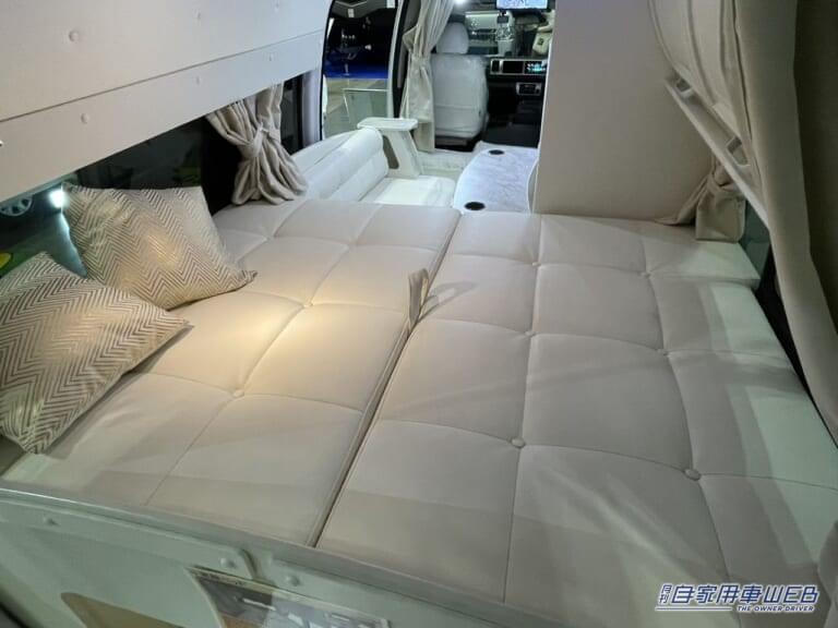 リアには180cm×140cmの常設ベッドが設けられ、大人2人が余裕を持って就寝できる。さらに縦方向に展開できるサブベッドも用意されており、使い方の幅が広がる構造となっている。ベッド下は大型収納スペースとして活用でき、アウトドア用品や日用品を効率よく積載可能。車内で過ごす時間を快適にする工夫が随所に施されている。