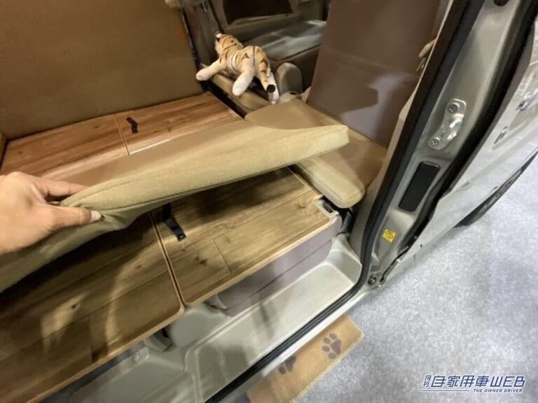 また、絶妙な高さに設定されたテーブルも特徴的だ。キャンプ時の食事はもちろん、リモートワーク用のデスクとしても十分に活躍する。椅子に座ったときの自然な姿勢を保てるため、長時間作業しても疲れにくい。さらに座面下には収納スペースが確保されており、タオルや衣類、調理器具などを整理して収められる。小さな工夫の積み重ねが、軽キャンでありながら驚くほどの快適性をもたらしている。