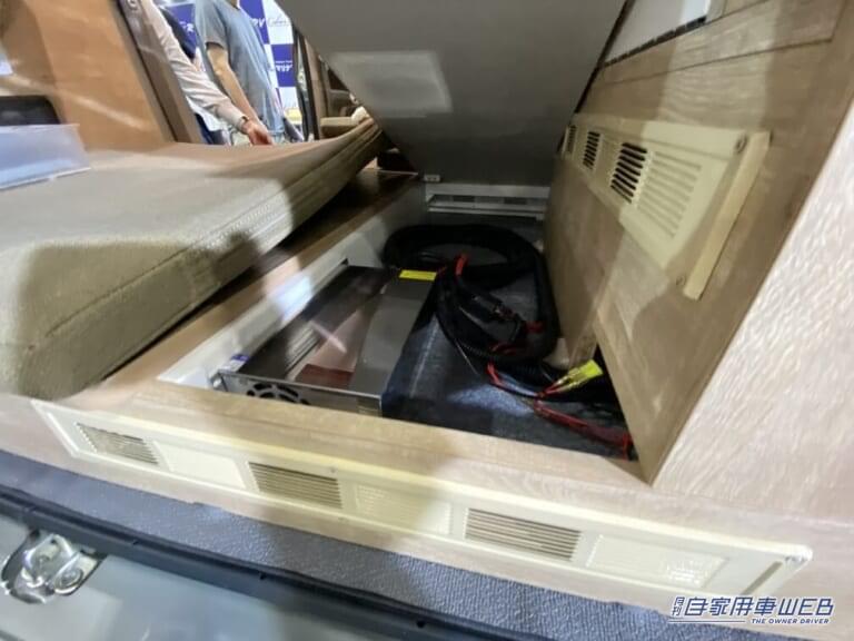 キャビン 2mini Frozooの特徴のひとつが、電装系を床下にスマートに格納している点だ。車内の限られたスペースを最大限活用するため、バッテリーや配線類を視界から隠すことで、居住空間をすっきりと保っている。利用者にとっては、車内でくつろいでいるときに機器類が邪魔にならないのは大きなメリットだ。