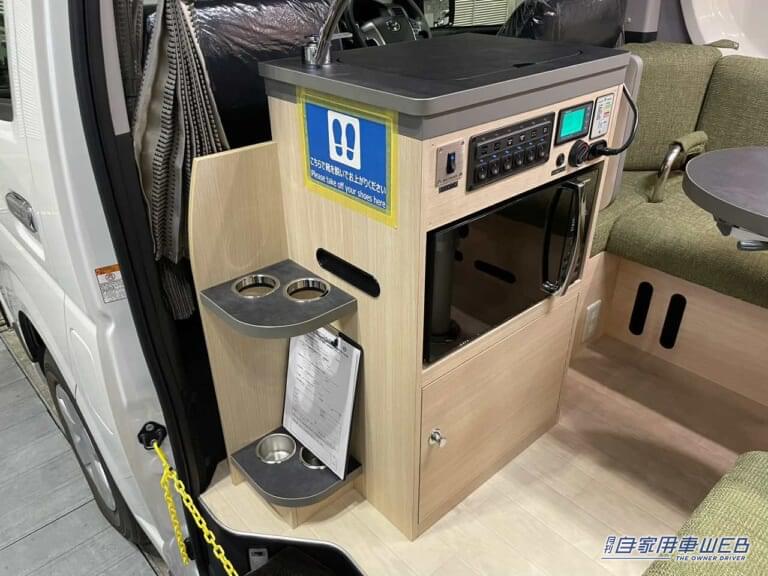 冷蔵庫はキャンピングカー専用の40Lタイプを装備。電源を確保しやすい設計のため、肉や魚、飲料を安心して保存できる。さらに電子レンジも標準装備されており、手軽な調理や温め直しが可能だ。長期の旅でも外食に頼らず、車内で充実した食生活を送ることができる。
