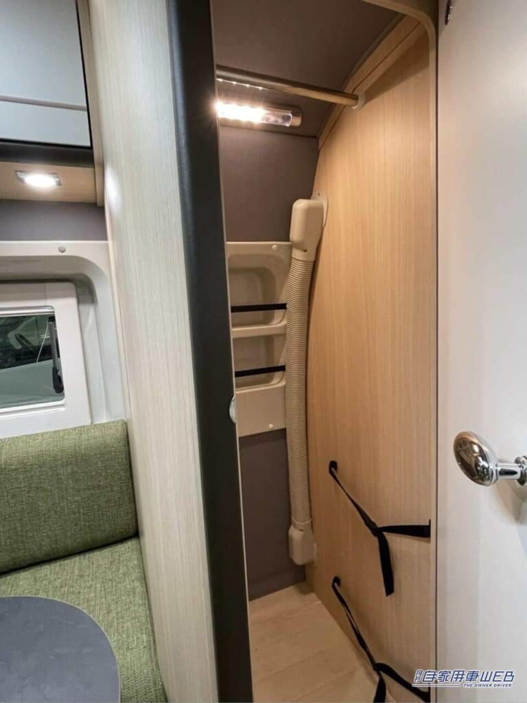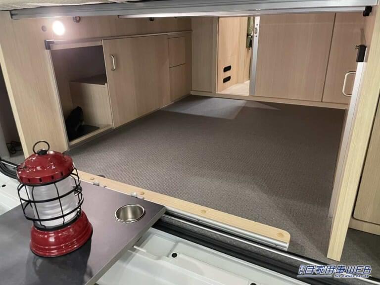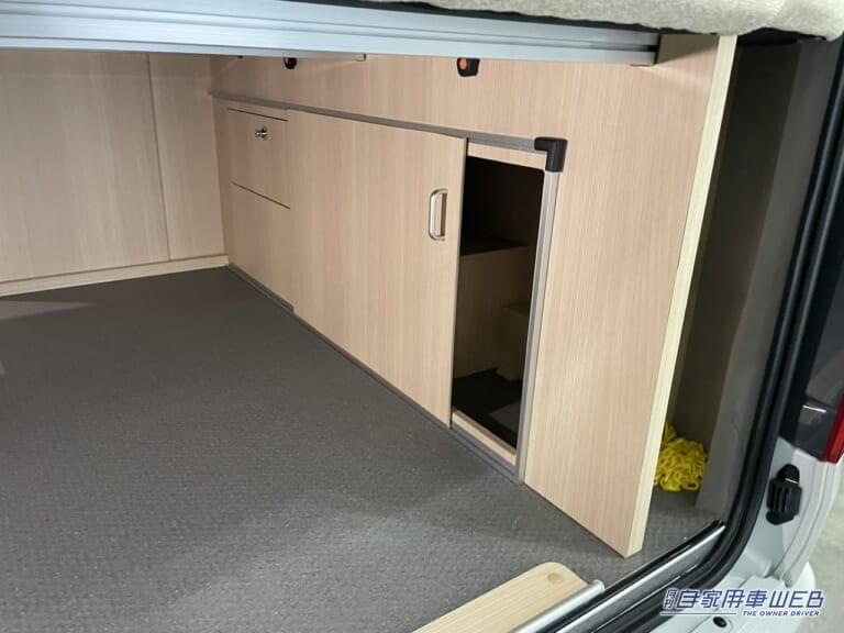 さらに、中央にはフリールームが設けられ、収納やクローゼットとして活用できるほか、カセットトイレを置けば簡易トイレとしても利用できる。小さな空間ながら多様な用途に対応できるのは、長年キャンピングカーを手掛けてきたRVトラストの経験が生きている部分だろう。
