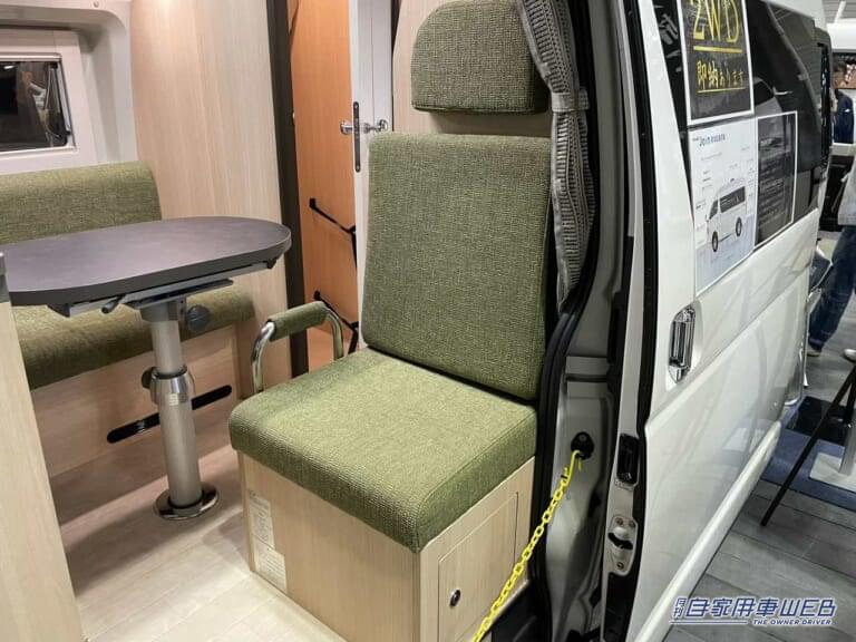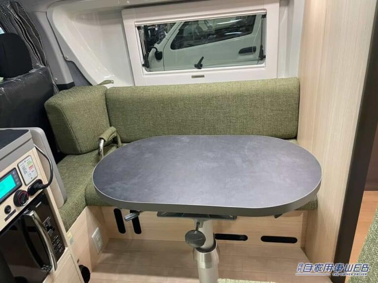 車内中央に配置されたダイネットは、明るい木目調とモスグリーンのシートが調和し、落ち着いた雰囲気を漂わせる。シートは座り心地に配慮されており、長時間の滞在でも快適さが保たれる。テーブルは回転機構を持ち、車内の移動を妨げない設計となっている。