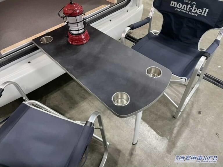 車外で使用できる折りたたみ式のテーブルは邪魔にならない適度なサイズで使いやすい。