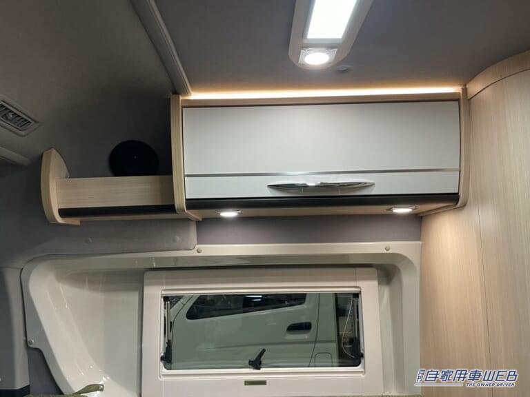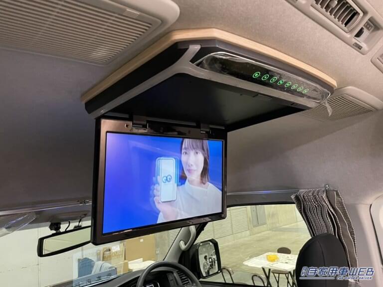 車内には集中スイッチがあり、照明の電源をまとめてコントロール可能。DCクーラーやFFヒーターも備わっているため、真夏の暑さや冬の寒さにも対応できる。停車中には15.6インチのフリップダウンモニターを利用でき、映像コンテンツを楽しむことも可能だ。電源切替スイッチが運転席横にあるため操作性も高い。