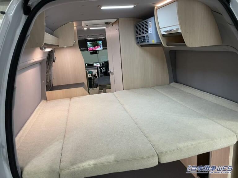 ベッドは後方に常設されており、夜はシートを展開する手間なく横になれるのが便利だ。ベッドマットには耐圧分散に優れるオリジナルプロファイルウレタンを採用し、長時間の睡眠でも快適さを損なわない。サイズは1,850mm×1,400mmと、大人2人がしっかり横になれる広さを確保している。