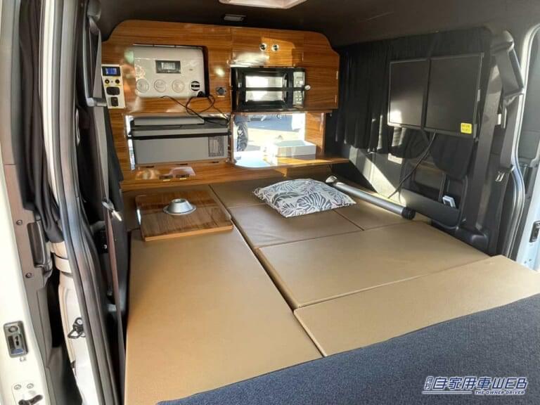 一人旅ではベッドを展開しなくても横になれるほどの余裕があり、気軽に休憩や仮眠が可能だ。二人での就寝にも対応しており、ベッドマットは180cm×138cmと大人二人がしっかり横になれるサイズ。もちろんペットと一緒にくつろぐこともでき、愛犬を連れての旅にも相性が良い。