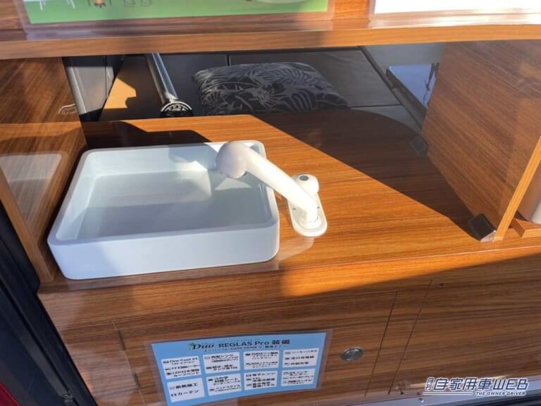 レグラス プロには、リア助手席側に24インチモニターが設置されている。大画面で映像を楽しめるだけでなく、テレワークや資料確認にも活用できるのがポイントだ。キャンピングカーが単なる旅の道具から、移動オフィスやセカンドリビングへと進化していることを感じさせる装備といえる。