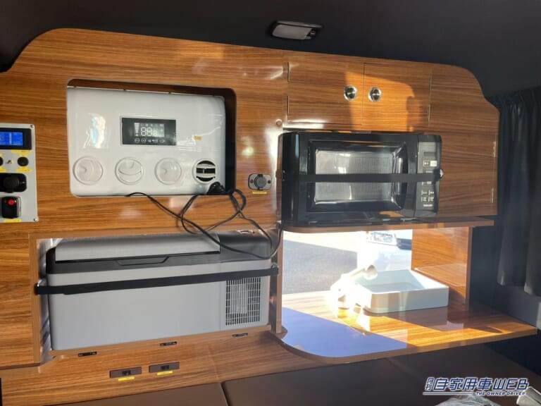 車内での時間を豊かにするのが、リアに配置されたギャレーだ。シンクにはシャワーヘッドが備わり、車内外どちらからも使える仕様となっている。給排水タンクは各10Lで、簡単な調理や洗顔などには十分な容量だ。電子レンジはヘルツフリー対応のため全国どこでも使用可能で、調理や温め直しを手軽に行える。