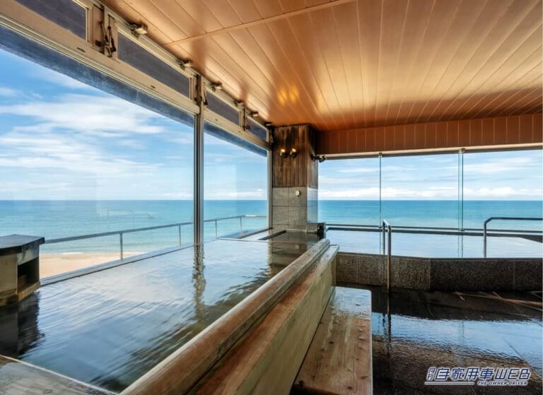 愉海亭みやじま:日本海一望の180度大パノラマが臨める屋上の展望大露天風呂。水平線までまっすぐな海の見える大浴場。