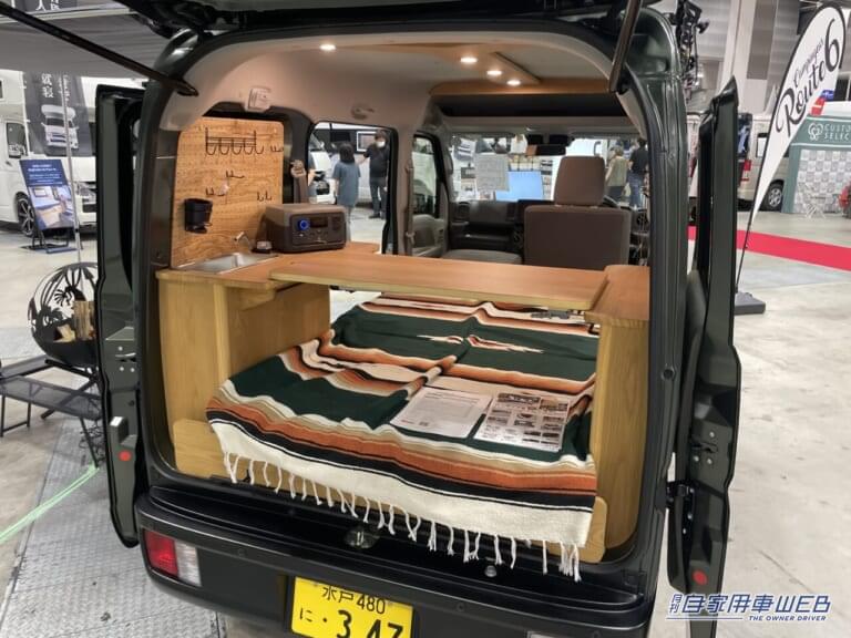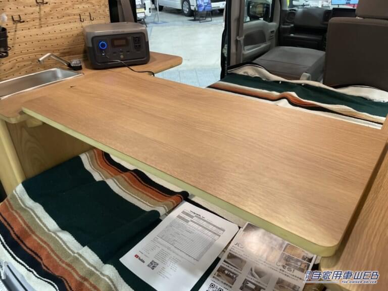 テーブルは車内外どちらでも使える仕様で、昼間は外に出してキャンプテーブルとして使い、夜は車内に戻して食事スペースに早変わり。機能をひとつに絞らない柔軟さが、このクルマの「気軽に旅を楽しむ」というテーマを象徴している。
