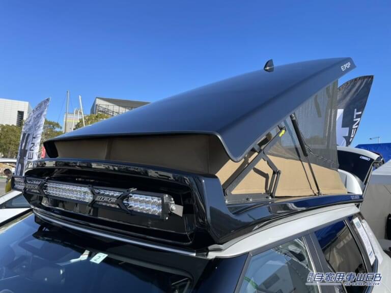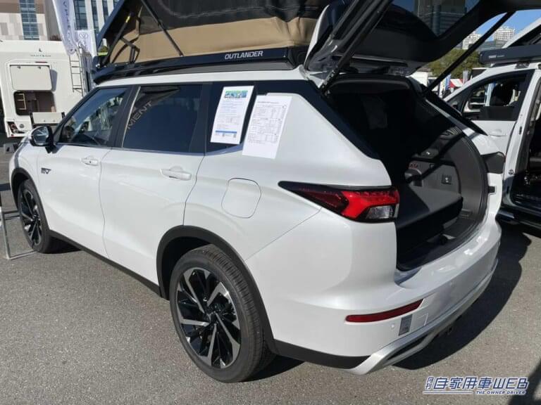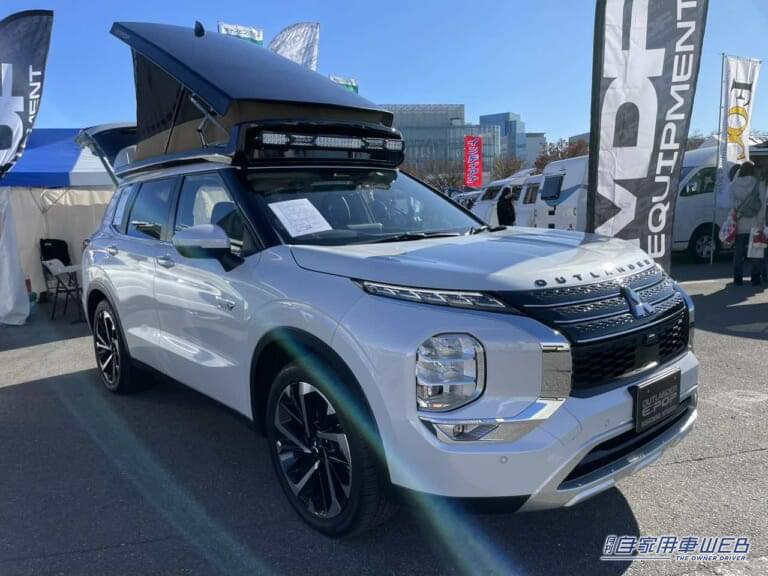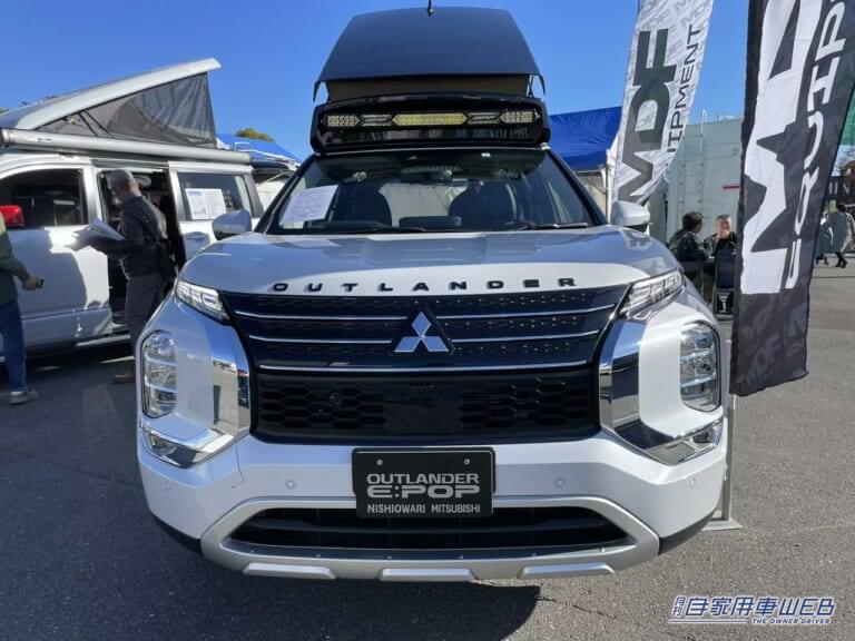 アウトランダーPHEVをベースにした「イーポップ」は、電動SUVの持つ走破性と静粛性をそのままに、快適な旅の空間をプラスしたキャンピングカーだ。最大の特徴は車体上部に設けられたポップアップルーフ。これを開くことで、車内の空間が一気に倍増し、大人2人がゆったりと寝られるベッドスペースが出現する。まさに“電動SUVの新たな使い道”を提案する存在と言える。