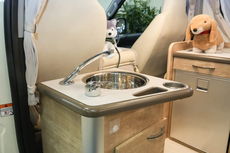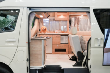 キッチンは助手席後方に集約され、シンク、冷蔵庫、収納棚をコンパクトに配置。スライドドア付近の空間を広げ、愛犬のケージ置き場を確保する工夫が光る。明るい内装と相まって、使い勝手も良好だ。