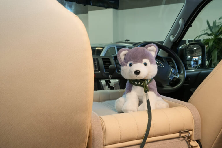ペットと旅するソランならではの「愛犬専用ベッド」。運転席と助手席の間に設置され、オーナーが運転中でも愛犬の様子をすぐに確認でき、リードフックで安全も確保。旅の道中も愛犬と共に過ごせる特別な設計だ。