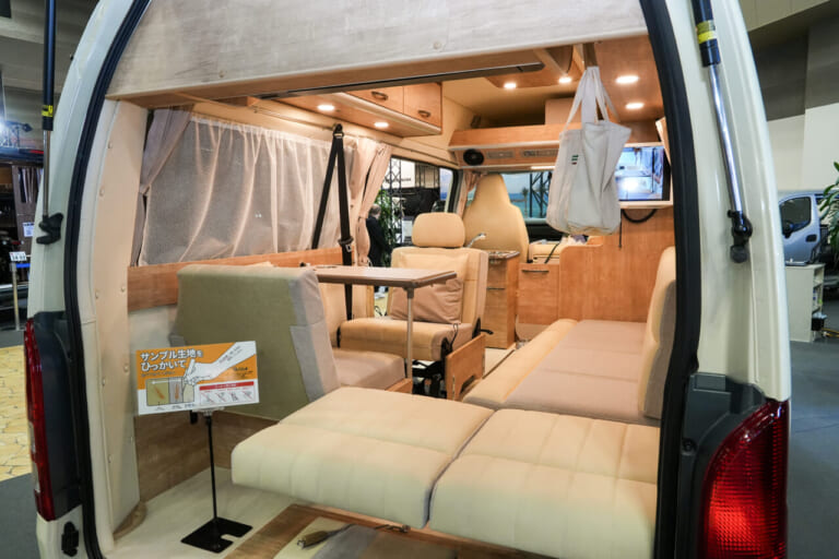 ほかにもスポットライト型のLED照明が温かみのある空間を演出するほか、機能面では走行用リヤクーラーユニットを下方に移設し、その上部を運転席上部収納棚として活用できるなど、老舗のキャンピングビルダーならではの、限られた空間を最大限に活かす独自のレイアウトも見逃せない。