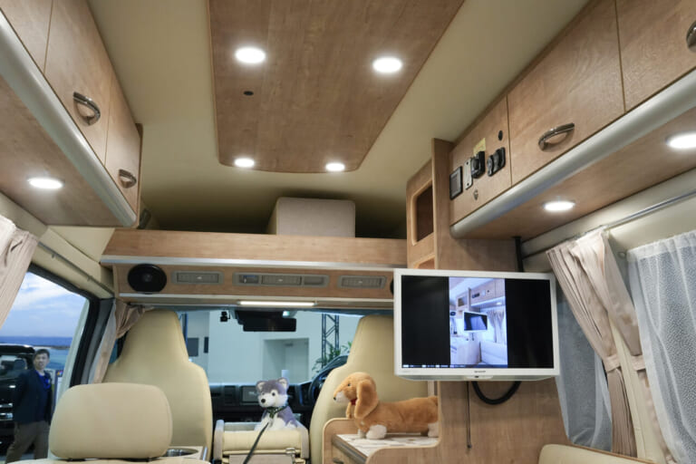 エンタメ設備も充実。車載テレビを設置し、天井と両サイドには扉付きのオーバーヘッド収納を完備。各種電装品のコントロールパネルも集約され、快適で使い勝手の良い移動空間となっている。